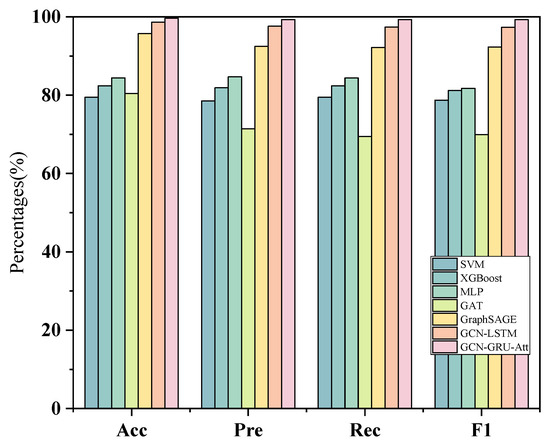 We compared the model in this paper with three groups of baselines. The first group considers only node features, including MLP, XGBoost, and SVM [30]. The second group contains generalized GNN models, including GCN [31], GAT [32], and GraphSAGE [33]. The third group comprises the combined model GCN-LSTM considering spatio-temporal features.