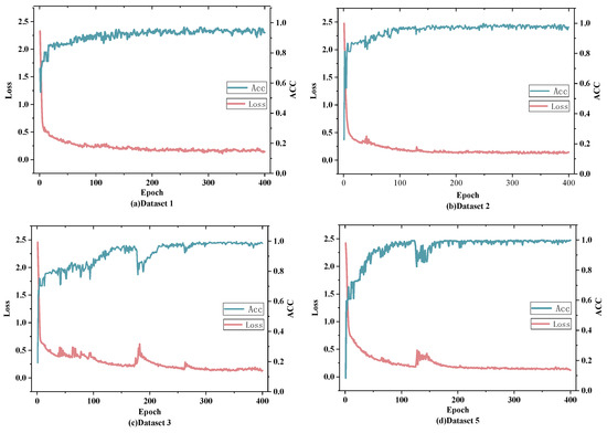 In order to verify the training performance of this paper’s model under different data volumes, four datasets were selected in this paper, with 1000, 2000, 3000, and 5000 nodes, respectively. As shown in Figure 13, in datasets 1 and 2, the training loss values and accuracy rates of the two datasets change dramatically when the epoch is less than 50, and show a small range of fluctuation after 50 epochs, at which point the training accuracy tends to increase and training loss value tends to decrease. When the epoch is between 300 and 400, the accuracy fluctuates slightly at around 0.97–0.98, and the loss value fluctuates slightly at around 0.13, and then stabilizes. In datasets 3 and 4, the training loss values and accuracy of both datasets change drastically when the epoch is less than 50, and fluctuate more dramatically when the epoch is in the interval range f rom50 to 200, but fluctuate less after the epoch is greater than 200. When the epoch is between 300 and 400, the accuracy fluctuates around 98%, and the loss value fluctuates around 0.12 and then also stabilizes around 400. This shows that the trained network is able to adapt to new unseen data with the same distribution as the training data, and that the size of the dataset does not have a significant effect on the convergence of the loss values of the model and the accuracy of the model results.