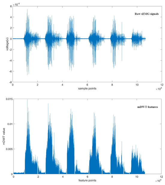 The raw sEMG signals were first transformed into low-dimensional feature vectors with increased information density, i.e., one feature point was calculated from a sliding window of 100 ms (with 200 sampling points) and the information of the whole window was compressed into one feature point. Generally, the features extracted from a time-frequency domain (TFD features) contain more information from both the temporal and frequency domains [25]. In this study, marginal discrete wavelet transform (mDWT) was used to extract the TFD features, for they performed better in the prior study [26]. The mDWT features were calculated as Equation (1), where represents the deepest decomposition level (; N represents the wavelet order) and was set at 3 in this study; and . In this work, a Daubechies 7 wavelet (N = 7) served as the mother wavelet. The sliding window was 200 ms in length with a 10 ms increment. The comparison of the raw signals and the corresponding mDWT features is presented in Figure 3.