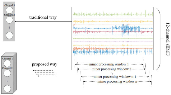 Instead of the traditional segmentation of sEMG signals, which treats an entire analyzing window as a single sample, a long-exposure strategy akin to [30] was used for the sample segmentation. To be more precise, a long-exposure sEMG sample set was created from the raw sEMG that contained 200 subframes of mDWT features (where each subframe mDWT feature was calculated from a 100 ms raw sEMG with a 0.5 ms increment). As Figure 4 shows, the traditional way extracts mDWT features from a whole analyzing window; however, the proposed way splits one analyzing window into several minor processing windows (where each minor processing window contains a 100 ms raw sEMG with a 0.5 ms increment) to calculate the subframes of mDWT features. The final input would be built with 200 subframes, and the final sample size was (i.e., numbers of sEMG channels × (S + 1) = 48, where S represents the deepest decomposition level mentioned in Section 2.2). Obviously, the long-exposure structure includes more sEMG information in time and space dimensions than traditional segmentation.