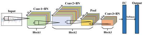 The proposed LECNN structure. All three convolutional layers contained a convolutional layer and a BN layer, while an additional pooling layer was added in Block2. A ReLU layer was adopted as an activation function after each BN layer. The sizes of filters in the three convolutional layers were , , and , respectively. The pooling operation was completed using filters.
