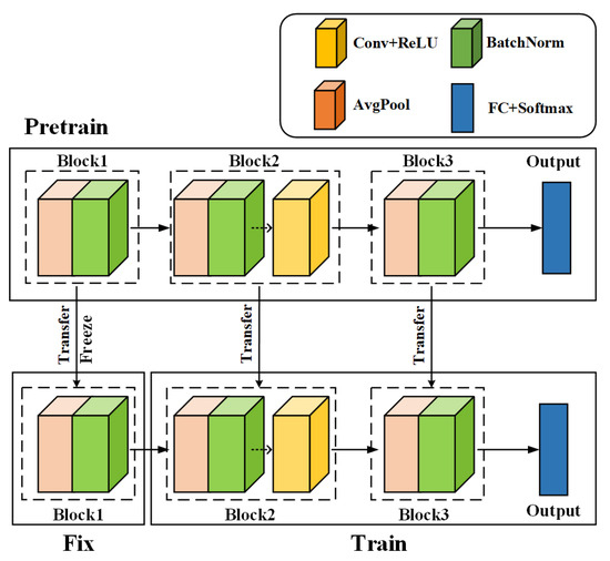 The process of transfer learning. Parameters of three convolutional blocks in the pretrained source model were first transferred to the target model, serving as the initial value of the parameters. The parameters of Block1 were then fixed without updating, while Block2, Block3, and the fully connected layer were finetuned using the target data.