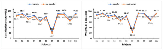 The average classification accuracy and weighted F1-score of the LECNN-TLs were significantly higher than LECNN-Onlys ( and vs. and , respectively, p-value = 0.0005 < 0.05, and Cohen’s d = 0.24 > 0.2). Figure 7 shows the comparison of each LECNN-Only and LECNN-TL model pair of the classification accuracy and weighted F1-score. As shown in Figure 7, the classification accuracies after transfer were all higher than their non-transfer counterparts, and the improvement on s3, s7, and s9 exceeded 5%.