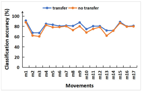 In Figure 7, the classification accuracies of the different subjects were covered up; however, the improvement in the averaged classification accuracy did not equal the improvement on each gesture. To investigate the effectiveness of transfer learning for each gesture, the average classification accuracy of each gesture across the 11 amputees was calculated. As Figure 8 shows, the blue line (LECNN-TLs) showed higher accuracies than the orange line (LECNN-Onlys) across all 17 gestures. In other words, no negative transfer (i.e., the performance of the models declined after applying the transfer learning) occurred during the process of the transfer learning, which also proved the effectiveness of our proposed transfer learning strategy.
