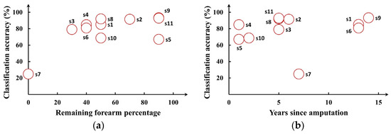 Correlations of classification accuracy and two clinical amputation parameters. (a) is the correlation between classification accuracy and Remaining forearm percentage. (b) is the correlation between classification accuracy and Years since amputation.