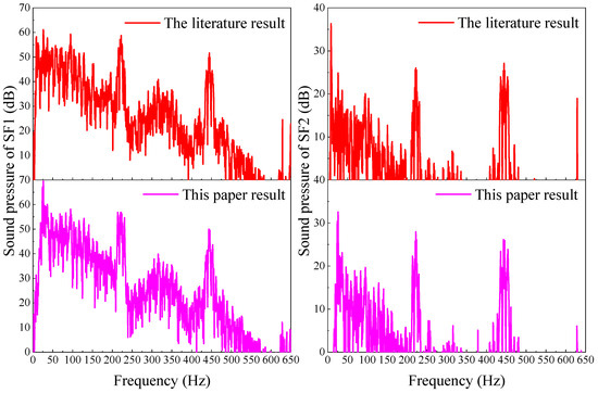 The comparison of sound radiation characteristics shows in Figure 7 and Figure 8 that the sound power and sound pressure spectrum curves are very similar, and the frequencies of sound radiation peak are basically the same in most frequency ranges. The main difference is reflected in the 0~50 Hz frequency range; it can be seen that because the vibration of SSSFST is larger through comparison of vibration, the sound radiation capacity is stronger. The vibration of the floating-slab is mainly manifested as the whole bending vibration below 15 Hz, and the acoustic radiation characteristics of the long floating-slab are stronger than those of the short floating-slab. Therefore, the comparison with the research results in the literature [34] can verify the effectiveness of the acoustic prediction method in this paper and can effectively predict the acoustic radiation characteristics of SSSFST.