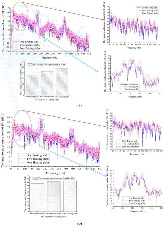 The linear sound pressure levels at field points SF1, SF4, and SF8 were used as examples to further analyze the effect of different numbers of floating-slabs on the acoustic radiation of the track structure. Figure 10 gives the linear sound pressure level frequency spectral curves of the three sound-receiving points, and it can be seen from the Figures that the overall sound pressure of the same scene increased with the number of floating-slabs, which was more obvious in the main vibration frequency range. Due to the influence of acoustic effects, such as superposition and phase extinction, on the propagation of sound waves radiated from different floating-slabs, the trend of the linear sound pressure spectrum curve was not as regular as the sound power spectrum curve, and the sound power spectrum curve showed more obvious differences. Using the main vibration frequency range where the sound pressure spectral curve was different, it can be seen that at the same height of the field points SF1 and SF4, the sound pressure radiated by the four floating-slabs in the main vibration frequency range was significantly stronger. At the nearest field point, SF8, the difference between the sound pressure radiated by the two and four floating-slabs was very small.
