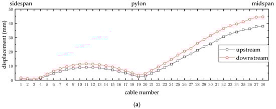Considering the symmetry of the bridge, only the load case where the train drives from the west side to the east side on the downstream tracks was analyzed. The spatial distribution of the extreme value of the displacements and accelerations at the connection of the beam and cables for each of the 38 cables on the upstream and downstream sides near the west side is given in Figure 9. The amplitude of the displacements under the moving loads was taken as the difference between the initial deflection and the minimum value of the deflection temporal curves.