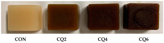 The recipe of Yanggaeng was established based on previous research, and the ratios are presented in Table 1. To prepare the CQ powder, various weight ratios (0%, 2%, 4%, and 6%) were added to the white bean paste of the control (CON) group, which had been determined through several preliminary experiments. The agar powder was soaked in distilled water for 10 min, then heated at 80 °C for 2 min. Subsequently, CQ powder, agar powder, and sugar were incorporated and heated while stirring for 10 min until foam formed and the mixture thickened. This mixture was then poured into a mold, cooled at 4 °C, and used as a sample for this experiment.