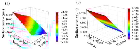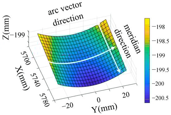 The calculation of the scallop height vertex coordinates generated by the two paths is completed by Equations (19) to (28), and the obtained coordinates are substituted into the theoretical surface equation (Equation (2)). The theoretical z coordinates can be obtained from the following formula.