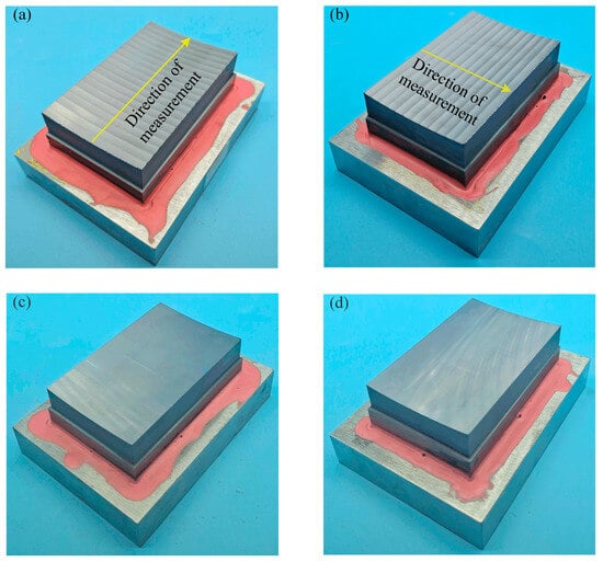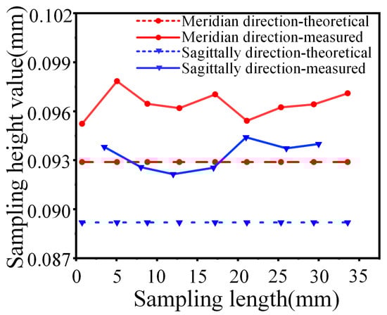 The scallop height profile of the off-axis parabolic surface after rough grinding was measured, as shown in Figure 4. The measured value of the scallop height along the meridian direction is about 0.0964 mm, and the measured value of the scallop height along the arc vector direction is about 0.0933 mm. It was found that the scallop height of the raster path along the arc vector direction is smaller than that of the raster path along the meridian direction.