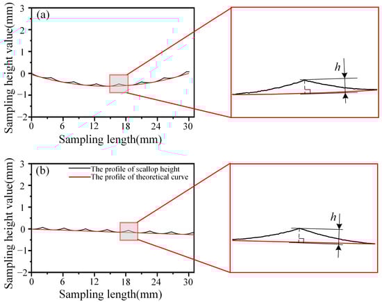According to the scallop height model, the scallop height at the two center lines of the off-axis parabolic surface was calculated. The calculated results were compared with the experimental results, as shown in Figure 11. The measured scallop height along the meridian direction is about 0.0964 mm, and the theoretical scallop height is about 0.0928 mm. The measured scallop height along the arc vector direction is about 0.0933 mm, and the theoretical scallop height is about 0.0892 mm. The error between the simulation value and the actual value is less than 5%. The accuracy of the scallop height model is verified.