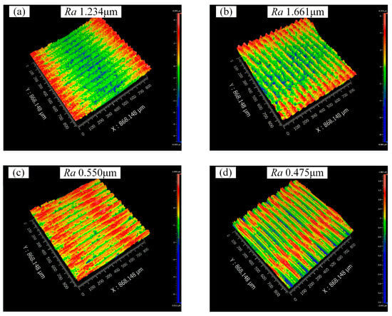 Surface roughness after grinding: (a) rough grinding surface morphology: step along the meridian direction; (b) rough grinding surface morphology: step along the arc vector direction; (c) finish grinding surface morphology: step along the meridian direction; (d) finish grinding surface morphology: step along the meridian direction.