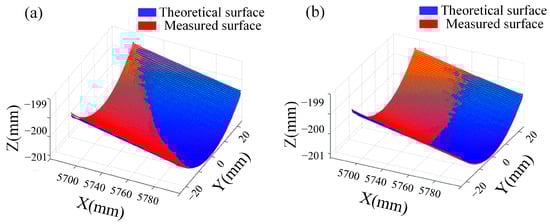 Comparison between the measured surface and the theoretical surface: (a) step along the meridian direction; (b) step along the arc vector direction.