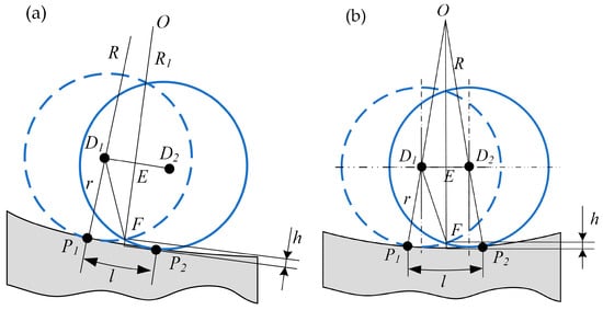 When stepping along the meridian direction, it is assumed that the coordinates of the cutter contact points corresponding to the adjacent grinding wheel paths are P1(x1, y1) and P2(x2, y2), respectively. Because the radius of curvature of each point on the parabola is not equal, the radius of curvature of the two cutter contacts points and the small arc between the two points on the parabola are not equal. However, in the grinding process, the step pitch between the adjacent grinding wheel path is usually very small. In the step direction, the curvature radius of the bottom point of the scallop height is close to that of the wheel contact point (R1 ≈ R). To simplify the calculation, the radius of curvature R of the current wheel contact is used to replace the radius of curvature of the bottom point of the scallop height. On this basis, a generalized model of the scallop height of the two wheel paths was established.