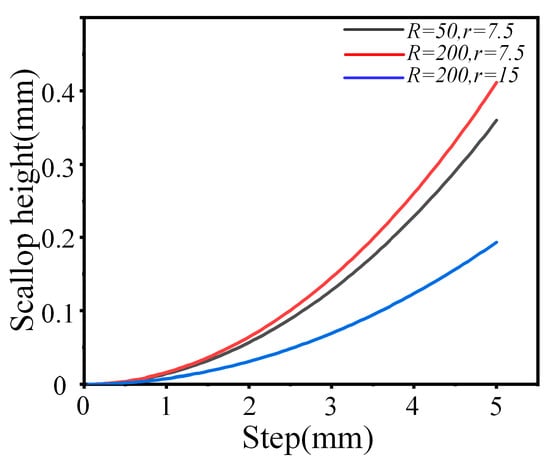 In the grinding process, to obtain a lower scallop height, a larger grinding wheel radius should be selected as far as possible for processing. To avoid local interference, Equation (10)’s condition should be satisfied. The increase in the radius of the grinding wheel gradually reduces the effect of reducing the scallop height and increases the manufacturing cost, the shape accuracy of the grinding wheel is more difficult to guarantee, and the wheeling requirements are higher.