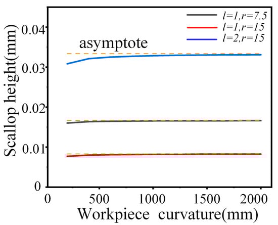 The scallop height h is positively correlated with the workpiece curvature R. The simulation calculation is shown in Figure 10. It can be seen that the greater the curvature R of the workpiece, the greater the scallop height. The dashed line is the asymptote. Therefore, in the grinding process, to obtain a lower scallop height, the processing step is selected in the direction of the small radius of curvature of the workpiece.