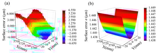 Diagram of the surface error distribution of the raster path stepping along the arc vector direction: (a) measurement; (b) simulation.