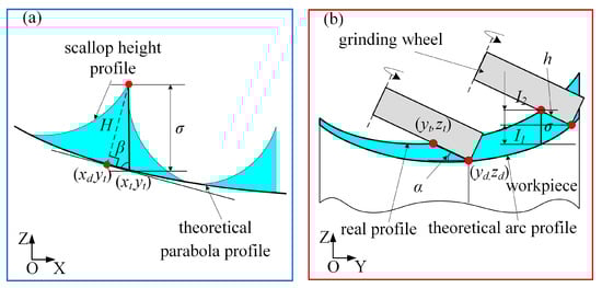 The grinding wheel is continuously fed. Therefore, it is considered that the x coordinate of the scallop height’s bottom point generated by the wheel path is continuous in the X direction of the surface, and its relationship with the x coordinate of the scallop height vertex is: