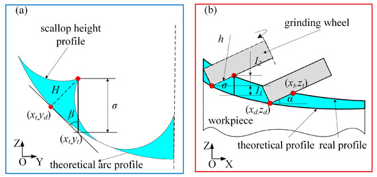 In the YOZ plane, the feed path is an arc, and the wheel maintains a fixed angle. The distance I2 between the scallop height and the tool contact point in the vertical direction remains unchanged. As the y value increases on the arc, I1 decreases in the −Y direction and increases in the +Y direction. The calculation of the surface error value is as follows: