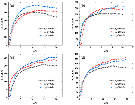 The stress–strain curve under different moisture contents: (a) ω =14%, (b) ω = 17%, (c) ω = 21%, and (d) ω = 24%.
