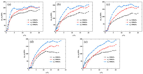 The triaxial consolidation undrained method was used in the test. The axial loading rate was set to 0.8 mm/min during the test, and the confining pressure was controlled at 100 kPa, 200 kPa, and 300 kPa, respectively. If the stress–strain curve had no peak value, the stress corresponding to 15% strain was the ultimate stress. After completing the conventional triaxial test, we placed the prepared soil samples in the high–low temperature and humidity constant test chamber produced for freeze–thawing and the time of freezing and thawing was controlled at 4 h to ensure that 3 freeze–thaw cycles was 1 test cycle. Five test cycles of freeze–thaw cycles, i.e., 0, 3, 6, 9, and 12, were considered. After the freeze–thaw cycle, the triaxial shear test under freeze–thaw cycles was carried out. The test method and confining pressure setting were the same as the conventional triaxial test.
