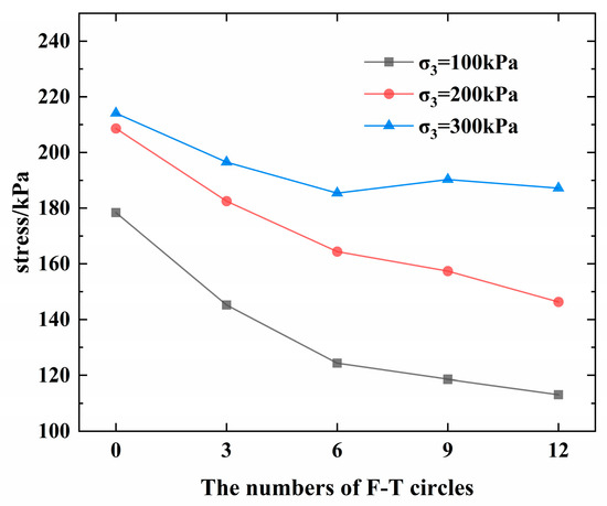 Figure 3 illustrates that under the same confining pressure, the growth rate of stress with strain gradually decreased as the freeze–thaw times increased. Meanwhile, the ultimate peak stress also decreased as a result of the freeze–thaw cycles. The initial stress was linearly proportional to the strain during triaxial compression and, then, gradually became a nonlinear relationship because of internal damage. Under different freeze–thaw cycles, the stress–strain curves of triaxial tests all showed strain hardening. Under the three confining pressures, the relationship between compressive strength and number of freeze–thaw cycles is shown in the Figure 4. It can be seen that the change rules were basically similar under the three confining pressures. As the number of freeze–thaw cycles increased, the compressive strength decreased significantly. In addition, the compressive strength value decreased significantly when the number of freeze–thaw cycles was small. When the freeze–thaw cycles reached a certain number, the compressive strength remained basically stable, and the change was small. It can be concluded that as the number of freeze–thaw cycles increased, the effect of the freeze–thaw effect on the compressive strength gradually weakened.