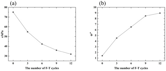 It can be seen from Figure 6 that as the number of freeze–thaw cycles increased, the cohesion tended to decrease, while the internal friction angle tended to increase. For small numbers of freeze–thaw cycles (within six cycles), the freeze–thaw cycles greatly affected both cohesion and the internal friction angle. When the number of freeze–thaw cycles reached roughly nine times, cohesion and the internal friction angle generally stabilized, indicating little impact from freeze–thaw cycles on these shear-strength indices.