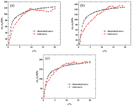 After the mechanical parameters of the damage model under the combined action of freeze–thaw cycles and loading were determined, they were listed in Table 4; the stress values under three confining pressures (100 kPa, 200 kPa, and 300 kPa) can be determined by using the final damage constitutive model. The measured data with a water content of 17% and six freeze–thaw cycles were compared with the theoretical data. As shown in Figure 7, when the confining pressure was 100 kPa, 200 kPa, and 300 kPa, the actual strength values were 118.4 kPa, 152.3 kPa, and 184.1 kPa, respectively, and the theoretical strength values are 120 kPa, 150 kPa, and 186 kPa. The fitting degree of the strength value was as high as 99%. The theoretical curve was basically consistent with the measured curve. The model can reasonably predict the damage evolution of soil under the combined action of loading and freeze–thaw cycles.