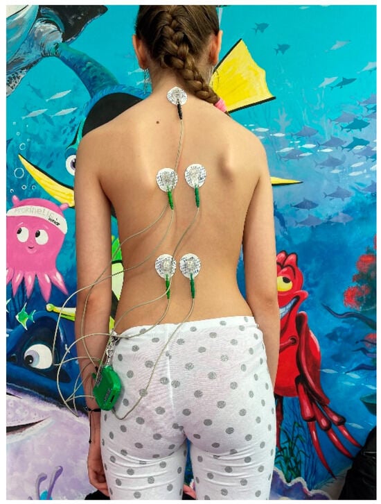 The position of the electrodes followed the paravertebral muscles at a distance of 2 cm from the spine’s axis; electrodes were symmetrically placed on the right and left side of the scoliotic’s curvature apex. A neutral electrode was positioned on the spinous process of the C7 vertebra (