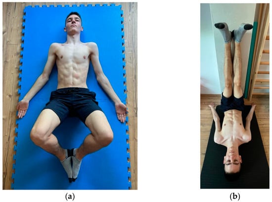 posture in the air, participants were in a supine position on a GPR (global postural reeducation) stretcher, but we adopted a modified position with legs supported on the wall. Their hips were flexed at a 90° angle with external rotation, while the knees were semi-flexed. The feet were in dorsiflexion with the heels together. The shoulders were positioned at 90° abduction, and the forearms were supinated with the fingers extended [