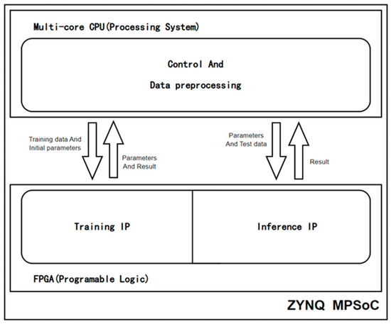 To sum up, hardware acceleration based on HA SoC makes the inference of neural networks more flexible, but few researchers use PL to accelerate the training process of the neural network [18,19,20,21]. Therefore, the integration of model training and forward inference cannot be realized, which will significantly improve the overall system performance and reduce the total cost and power consumption of the system [22]. In HA SoC, the flexibility of software and the parallel processing of hardware are profoundly integrated. The software running in the PS is responsible for data preprocessing and controlling the data flow. PL performs complex data operations during training and inference. This provides another realization method to further optimize the computing power of AI in terms of performance, cost, power consumption, flexibility, and adaptability [18,23].