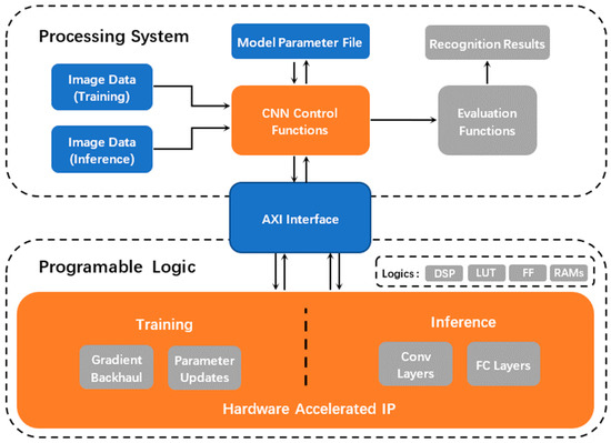 As shown in Figure 10, the entire convolutional neural network training and inference system is built in MPSoC based on IP core encapsulation and reuse techniques. The IP core for network training and inference is connected to the PS of the SoC through the AXI specification. The IP kernel of each module functions as follows: