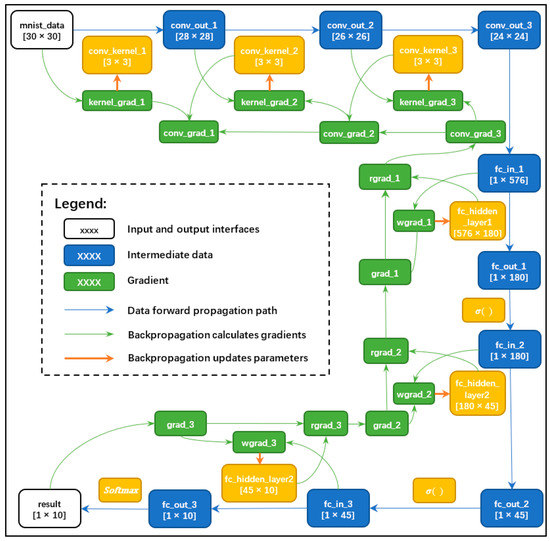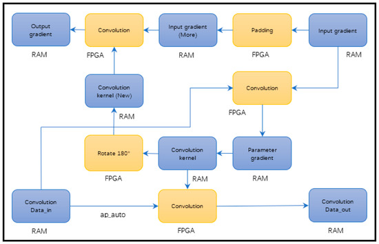 Figure 5 shows the data flow structure of image data forward propagation and gradient loss backpropagation in the LeNet-3.3 network. In the figure, the forward propagation of image data is used to train the model, and the backpropagation of gradient loss is used for model inference. In essence, the training of neural networks includes both the forward propagation of data and the backpropagation of gradient loss. Therefore, the inference of convolution neural networks is a part of model training, which is a prerequisite for the integration of training and inference in PL. In the integrated structure of training and inference, the trained network weights are stored in the corresponding RAM and can be directly used in inference without PS intervention. In essence, the integrated structure of training and inference significantly reduces the cost and power consumption of the computing power platform, while improving the flexibility, reliability, and real-time performance of the whole system, providing a new solution for the training and inference of artificial intelligence.