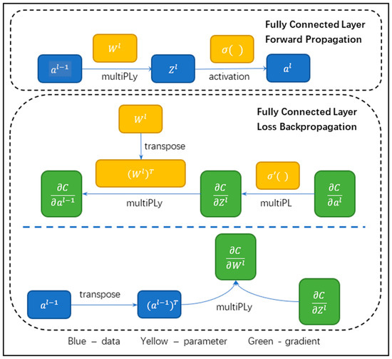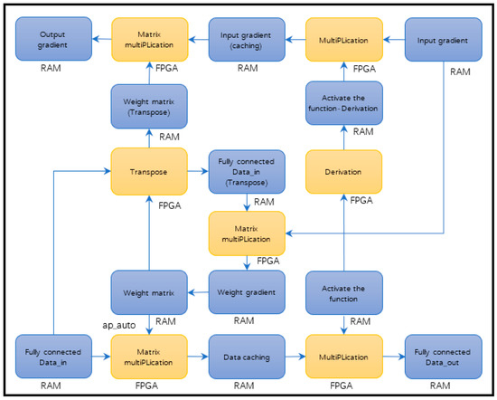 For the fully connected layer, the input and output feature graphs and gradients are one-dimensional vectors, and the weights and gradients are two-dimensional vectors. According to Equations (13) and (20), when the forward propagation of the fully connected module is realized, the output result of the fully connected module can be obtained by activating the function after the weighted operation of the feature graph and the weight. According to Equations (16) and (21), when the fully connected model is backpropagated, the output gradient of the backpropagation can be obtained after the input gradient is weighted by the derivative of the activation function and the transpose of the weight matrix. According to Equation (19), when the fully connected module is implemented to update the weight matrix, the gradient of the weight matrix can be obtained after the weighting operation of the transpose of the input gradient and the input feature graph, which can update the weight matrix combined with the learning rate. By combining Equations (13), (16) and (19)–(21), the forward propagation and backpropagation operation models of the fully connected layer are obtained. The most basic hardware accelerator structure of the fully connected module is shown in Figure 9.