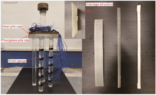 The bridge foundation model used in this test was small, so it would have been difficult to control its quality had it been made using poured concrete. Therefore, this test used plexiglass and steel as counterweights to make the main body of the bridge foundation structure. The superstructure of the bridge foundation was made of steel and designed with reference to Shengli Bridge in Tangshan. The pile cap was divided into two layers: the upper pile cap was made of steel, and its length, width, and height were 200 mm, 200 mm, and 20 mm, respectively. The lower pile cap was made of plexiglass with a length, width, and height of 210 mm, 210 mm, and 40 mm, respectively. The drainage system was based on the rigid-drainage piles proposed by Liu et al. [13]. The drainage structure of the bridge foundation was wrapped with a thin layer of wire mesh and covered with a layer of geotextile, and then pasted on both sides of the pile. Because the drainage structure of the sheet-pile wall took into account the influence of the wall’s thickness and strain gauge, the drainage structure was covered with a layer of geotextile, and then pasted on one side of the sheet-pile wall. The design of the sheet-pile wall was based on research by Partha et al. [33]. A plexiglass board with dimensions 410 mm × 580 mm × 6 mm (length × width × height) was adopted.