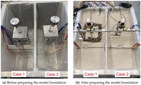 The model foundation was prepared as follows. The laminar shear box was divided into two parts by an 8 mm thick plank along the direction of vibration to prevent the sites from interfering with each other. The left part was used to prepare the foundation for the test group (Case 1) and the right part was used to prepare the foundation for the conventional group (Case 2). Then the bridge and sheet-pile wall structures were fixed in the model box, as shown in Figure 3a. Next, the laminar shear box was filled with water at a depth of 6 cm each time, and then sand was sprinkled evenly into the laminar shear box by limiting the falling distance until the water surface was submerged; this operation was repeated. Accelerometers and pore water pressure transducers were placed at the heights specified in the design. In addition, in the test group, a layer of pebbles with a grain size of about 9 mm was placed around the pile cap, which was connected to the path of the drainage piles to form the drainage channel. Then an iron bracket was installed on the shaking table to fix the displacement transducers. Finally, the prepared soil foundation was left for 12 h to allow the foundation to become compact. Figure 3b shows the model foundation after the preparation process was completed.
