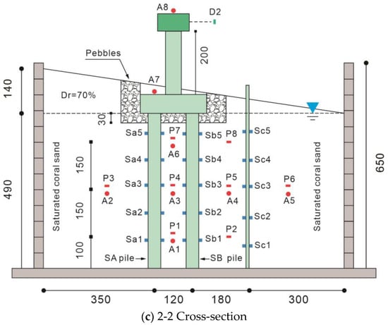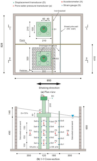 For the model foundation, the layout of components were the same for the test group and the conventional group. Figure 4 shows the plan and schematic cross-section of the model foundation along with the layout of components. Strain gauges were symmetrically attached to model piles and the sheet-pile wall to measure the bending moment. To investigate the seismic response of the sand at different depths, both accelerometers and pore water pressure transducers were arranged in three layers. In addition, displacement transducers were fixed on the shaking table via an iron bracket.
