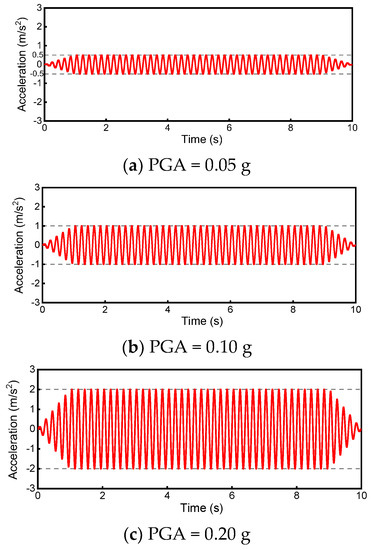The test conditions are shown in Table 4. Since variation in sinusoidal waves is simpler than in other types of seismic wave, they are more conducive to analysis of acceleration, excess pore water pressure ratio, and other responses of objects in experimental conditions. Therefore, a large number of scholars choose to input sinusoidal waves in shaking table experiments [34,35,36]. In this paper, the experimental results under the action of sinusoidal waves were analyzed. Sinusoidal wave excitations with seismic intensities of PGA (peak ground acceleration) = 0.05 g, PGA = 0.10 g, and PGA = 0.20 g were input, and the time-history curves of the input acceleration measured. The results are shown in Figure 5. It should be noted that before each change in sinusoidal wave frequency, white noise scanning was adopted to obtain the natural frequencies of the model foundation. The relative density of the coral sand was 70% before the test. The loading sequence for each seismic level is shown in Table 5.