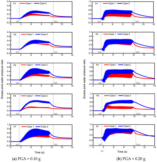 The layout diagram of the pore pressure gauge is shown in Figure 4. Due to the limitations in article length, for this paper, only the excess pore water pressure of P1, P3, P4, P5, and P7 measurement points were analyzed when PGA = 0.10 g and PGA = 0.20 g. Furthermore, the seismic response was more significant when PGA = 0.10 g and PGA = 0.20 g. Figure 6 shows the time-history curve of excess pore water pressure ratio. In the figure, 2.5 s was taken as the start time of the vibration excitation input. Under the action of PGA = 0.10 g, the excess pore water pressure ratio of the test group was significantly lower than that of the conventional group. This is due to the fact that the excess pore water in the conventional group could only be discharged from the soil through the irregular drainage channels formed by the soil during vibration excitation. The drainage channels formed between the drainage structure and pebbles in the test group had better drainage effects than those in the conventional group, thus effectively reducing the development of excess pore water pressure. In addition, the peak excess pore water pressure ratio of the conventional group reached 0.8 at the P7 measurement point, indicating that the soil in the conventional group had been liquefied. However, the peak excess pore water pressure ratio of the test group also occurred at the P7 measurement point, but its value was only 0.6, meaning it did not reach the liquefaction standard. When PGA = 0.20 g, after inputting vibration excitation, the excess pore water pressure ratio of both sites underwent rapid increase of about 1.5 s to reach the peak value. After reaching the peak, the excess pore water pressure ratio of the conventional group was maintained at a higher level compared to that of the test group, but the difference between them was not as large as when PGA = 0.10 g. This indicates that the effect of the drainage structure in the test group decreased as the vibration intensity increased. When the vibration excitation stopped, the excess pore water pressure ratios of the test and conventional groups started to decrease.