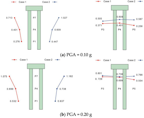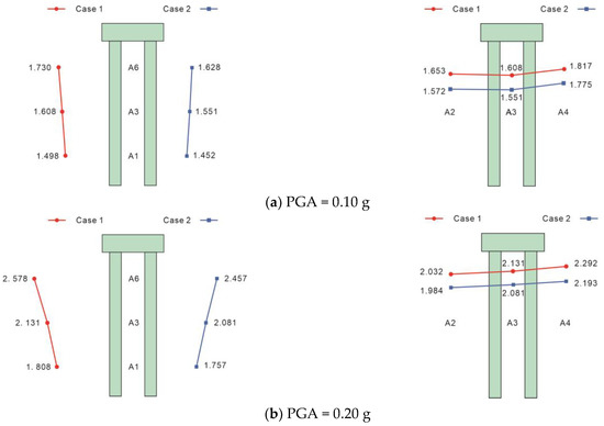 Figure 9 shows the acceleration amplification factors (i.e., the ratio of peak acceleration at the measurement point to peak acceleration input from the shaking table) of measurement points A1, A2, A3, A4, and A6. Under the action of PGA = 0.10 g, the acceleration amplification factors of both sites were larger than 1, and gradually decreased with the increase of buried depth, indicating that the upper layer of the foundation would be liquefied first, which conforms to the general laws of foundation liquefaction during earthquakes. The acceleration amplification factors of the measurement points in the test group were 1.06, 1.04, and 1.03 times those of the conventional group from top to bottom, and 1.05, 1.04, and 1.02 times those of the conventional group from far away from the sheet-pile wall to near the sheet-pile wall. When PGA = 0.20 g, the acceleration amplification factors of the two sites were greater than those measured under the action of PGA = 0.10 g, and the acceleration amplification factor of the test group was still larger than that of the conventional group, indicating that the drainage structure could discharge the excess pore water in the soil in a timely manner, thus maintaining a higher shear strength in the foundation.