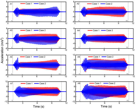 This section compares and analyzes the time-history curves of the acceleration of the test group and the conventional group when PGA = 0.20 g. The time-history curves of the acceleration when PGA = 0.20 g are depicted in Figure 8; in the figure, 1.0 s was used as the start time of the vibration excitation input. To facilitate the analysis of the test results, the time-history curves were divided into three stages: Stage 1 (within 1.5 s after the vibration excitation input); Stage 2 (between 1.5 s and 2.0 s after the vibration excitation input); and Stage 3 (between 2.0 s and 10.0 s after the vibration excitation was input). In Stage 1, the acceleration of the conventional group increased rapidly and attained peak acceleration. At this time, the foundation was not yet liquefied and had a certain shear strength. In Stage 2, the acceleration of the conventional group rapidly decreased to about half the peak acceleration, indicating that the site liquefied and the soil lost most of its shear strength. In Stage 3, the acceleration of the conventional group remained almost constant. On the whole, in Stage 3, the peak acceleration of the test group was larger than that of the conventional group, indicating that the drainage structure could effectively maintain the shear strength of the foundation soil and had a reinforcement effect on the bridge pile foundation. It should be noted that the acceleration of the A7 measurement point in the conventional group gradually decreased in Stage 3 because the A7 measurement point was close to the ground surface and the liquefaction was intense. In addition, the time-history curves of the acceleration recorded at the A3 and A8 measurement points of the conventional group were asymmetric, which may have been caused by the tilting of the accelerometer during the vibration excitation.