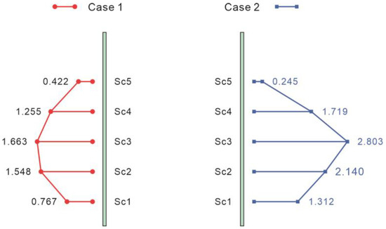 Figure 10 shows the distribution of bending moments along the depth of the sheet-pile wall under the action of PGA = 0.10 g. Under the action of PGA = 0.10 g, the sheet-pile walls’ maximum bending moments in the test and conventional groups were located in the middle (Sc3 measurement point) of sheet-pile walls, which were 1.663 N·m and 2.803 N·m, respectively, the latter being about 1.7 times greater than the former. The bending moment at the bottom (Sc1 measurement point) of the sheet-pile wall was larger than that at the top (Sc5 measurement point) in both sites, because the bottom of the sheet-pile wall was fixed with special glue and the bottom fixing of the sheet-pile wall could also withstand part of the bending moment. Overall, the bending moment of the sheet-pile wall in the test group was generally smaller than that in the conventional group, which indicates that the drainage structure on the sheet-pile wall in the test group could effectively drain the excess pore water and reduce the liquefaction of the soil around the sheet-pile wall. However, there was no drainage structure in the conventional group, so the excess pore water pressure around the sheet-pile wall could not be dissipated in time, resulting in a higher degree of soil liquefaction than that in the test group. In addition, the soil lost shear strength after liquefaction, producing more serious lateral spreading and greater lateral forces, which made the bending moment of the sheet-pile wall in the conventional group larger than that in the test group. The results indicate that sheet-pile walls reinforced by drainage structures are more stable during liquefaction.