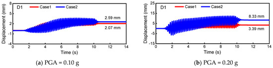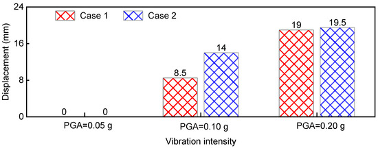 Time histories of lateral displacements of the bridge superstructure in two sites are depicted in Figure 11. Under the action of PGA = 0.10 g, the lateral displacement of the superstructure of the conventional group first experienced a slow rise, then reached a peak value about 5 s after the vibration excitation input, and remained stable until the vibration excitation input ended. The lateral displacement of the superstructure of the test group reached its peak value when the vibration excitation input was about 3 s. During the vibration excitation process, the vibration amplitude and residual displacement of the test group were smaller than those of the conventional group. After the vibration excitation, the residual displacements of the test and conventional groups were 2.07 mm and 2.59 mm, respectively. When PGA = 0.20 g, the lateral displacement of the superstructure of the test group developed rapidly and peaked within 1.5 s of the vibration excitation input, and then remained stable until the vibration excitation input stopped. However, the lateral displacement of the superstructure of the conventional group increased slowly throughout the vibration excitation input. Eventually, the residual displacement of the superstructure was 3.39 mm and 8.33 mm for the test and conventional groups, respectively. From the test results, it is known that when PGA = 0.10 g and 0.20 g, the residual displacement of the superstructure in the test group is smaller than that in the conventional group. The reason for this is that the drainage structure in the test group enabled the excess pore water to discharge in time, whereas in the conventional group it could not, resulting in a reduction in the effective stress of the soil and a reduction in shear strength, which eventually caused the bridge superstructure to produce greater lateral displacement.