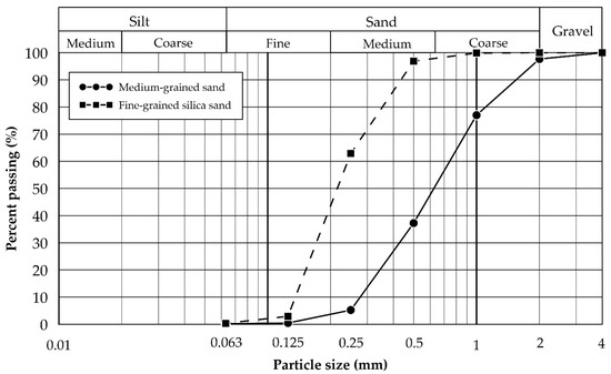 Particle-size distribution of medium-grained sand and fine-grained silica sand, determined according to DIN EN ISO 17892-4 [29].