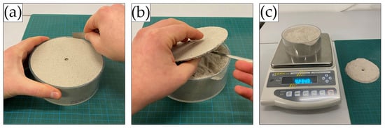 The biopolymer solutions were sprayed onto the samples using a trigger sprayer with a nozzle suitable for viscous solutions (Ballistol hand atomizer, standard nozzle, Figure 2c). Uniform and accurate spray-on application was achieved by placing the untreated samples on a precision scale (Kern PES 4200-2M, 0.001 g resolution) and spraying the solution until the required application rate was achieved. Changes in solution density caused by the addition of biopolymer were considered negligible, so a fixed solution density of 1.0 g/mL was assumed for converting the required volumetric application rate (20.3 mL) to the gravimetric application rate (20.3 g). A 3D-printed splash guard was used to prevent the biopolymer solution from inadvertently touching the scale’s weighing plate and thus distorting the scale readings (Figure 2c). After achieving the required application rate, the edges of the cylinder moulds were wiped dry. In the sample preparation process, the following weight measurements were recorded: weight of the empty sample moulds, dry sample weight, and total sample weight after biopolymer application.