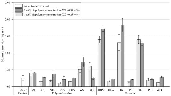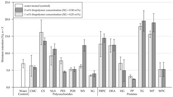 Polysaccharides. Compared to the control, the 1 wt% (XG = 0.25 wt%) treatments either increased or decreased the samples’ moisture retention. A slight reduction in moisture retention was observed for samples treated with CMC, POS, WS, and XG, whereas it increased for samples treated with CS, NLS, and PES. Relative to the 1 wt% treatment, the application of 2 wt% resulted in the samples’ moisture retention either decreasing, increasing, or changing negligibly. It decreased slightly for CMC and CS and significantly for PES, while no change was observed for POS. By contrast, it moderately increased for NLS and XG and even doubled for WS-amended samples.