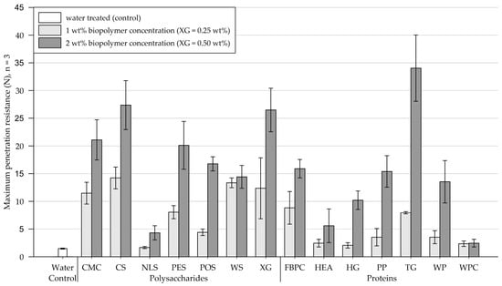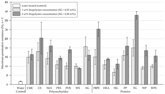 Comparison of polysaccharide and protein treatments. For amendments at 1 wt% concentration, polysaccharide-induced crusts, on average, endured slightly higher penetration resistances than protein-induced crusts. While doubling the concentration significantly increased the penetration resistance of almost all samples, the penetration resistance of protein-induced crusts displayed a disproportionate increase relative to polysaccharide crusts. At the higher biopolymer concentration, the protein-treated substrates, on average, showed higher penetration resistances than the polysaccharides.