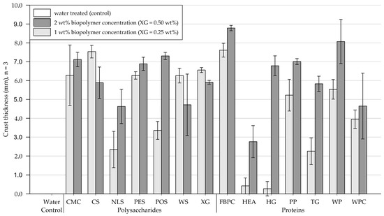 Mean thickness of crust formed on medium-grained sand samples. Biopolymers are grouped into polysaccharides and proteins with water as control. Tests were performed with six replicas (n = 3), with error bars indicating the standard deviation (SD). Note. The exact values of experimental results are appended in Table A5.