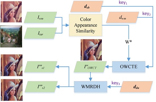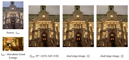 - Hsieh, K.S.; Wang, C.M. Constructive image steganography using example-based weighted color transfer. J. Inf. Secur. Appl. 2022, 65, 103126. [Google Scholar] [CrossRef]